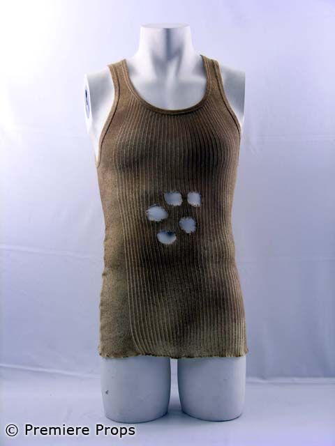 From the set of the entertaining film, The Rundown, this is Hatcher's (Christopher Walken) screen worn distressed tank top. This tank top is aged with multiple bullet holes and was used in an alternate ending.