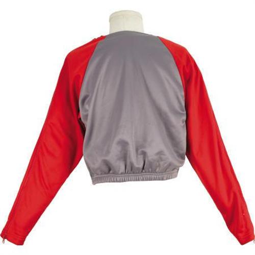 <B>"The Running Man" Screen-Worn Costume.</B></I> <I>Running Man</B></I> contestants uniform shirt of gray nylon with cherry red sleeves and zippers along the shoulders with a large embroidered "Running Man" logo on the back from <I>The Running Man</B></I> (1987). This cult film based on the Stephen King novel found actor Arnold Schwarzenegger and others trying to survive a public execution gauntlet staged as a game show. <I>Authenticated by the world's foremost curators of television artifacts, The Comisar Collection of Beverly Hills.</B></I><BR><BR><b>Shipping:</b> Clothing, Costumes & Jerseys (<a target="_blank" href="http://www.heritageauctions.com/common/shipping.php">view shipping information</a>)