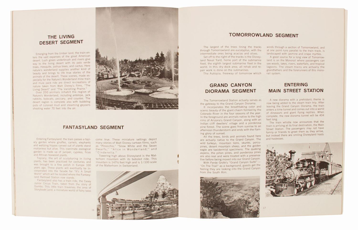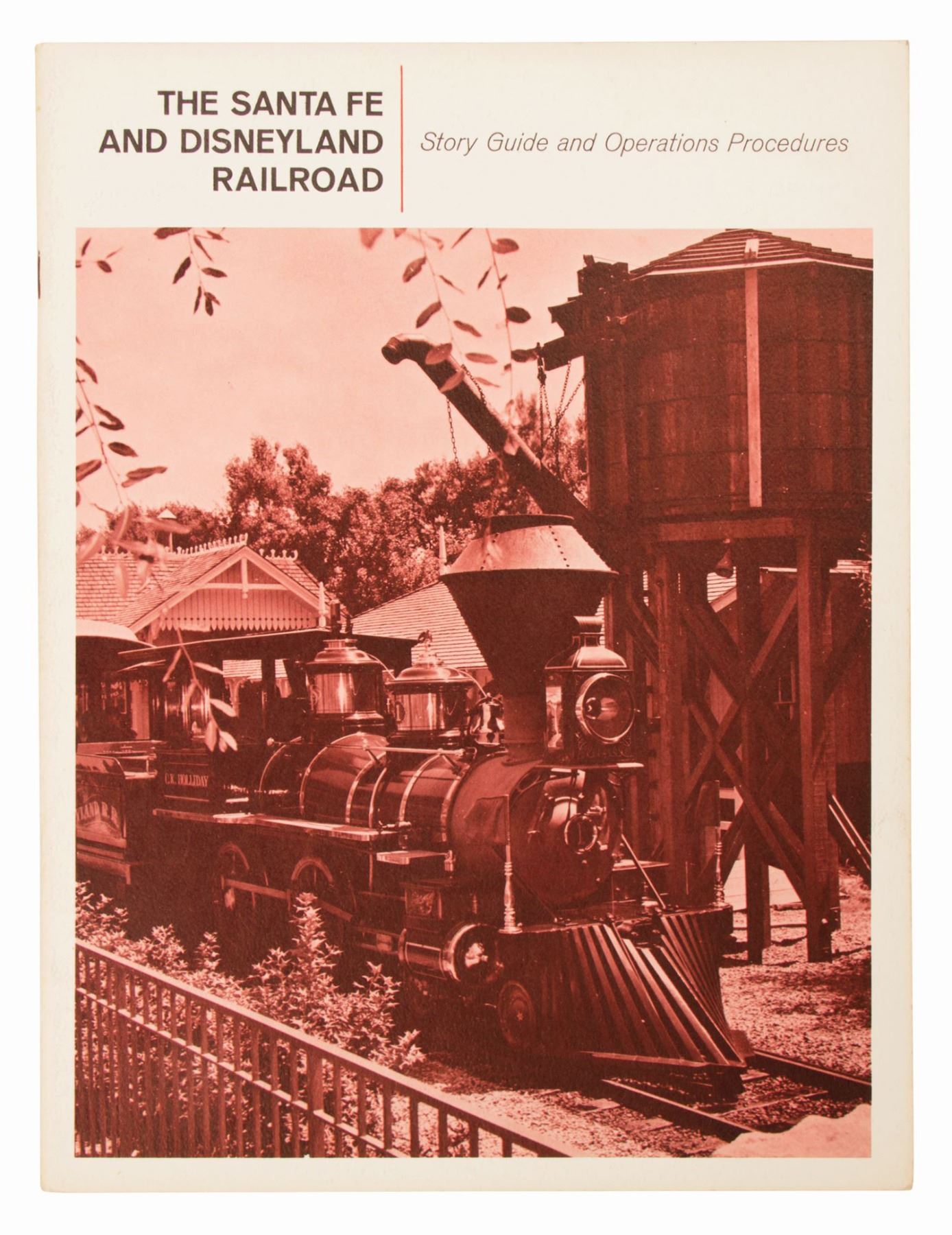 (Disneyland, 1965) A cast member manual for conductors, engineers, and firemen on the Santa Fe and Disneyland Railroad. Created by Disneyland University, the 29-page booklet gives background on Walt Disney’s love of trains, outlines operational procedures, and provides a detailed account of each area of the park through which the railroad runs. Measuring 11”x8.5”, the manual is in fine condition with only minor browning to extreme edges and minor handling wear.