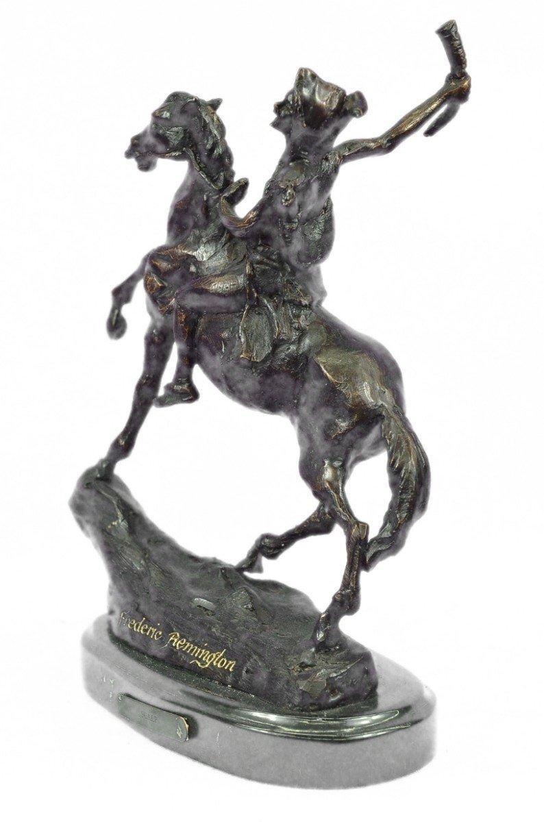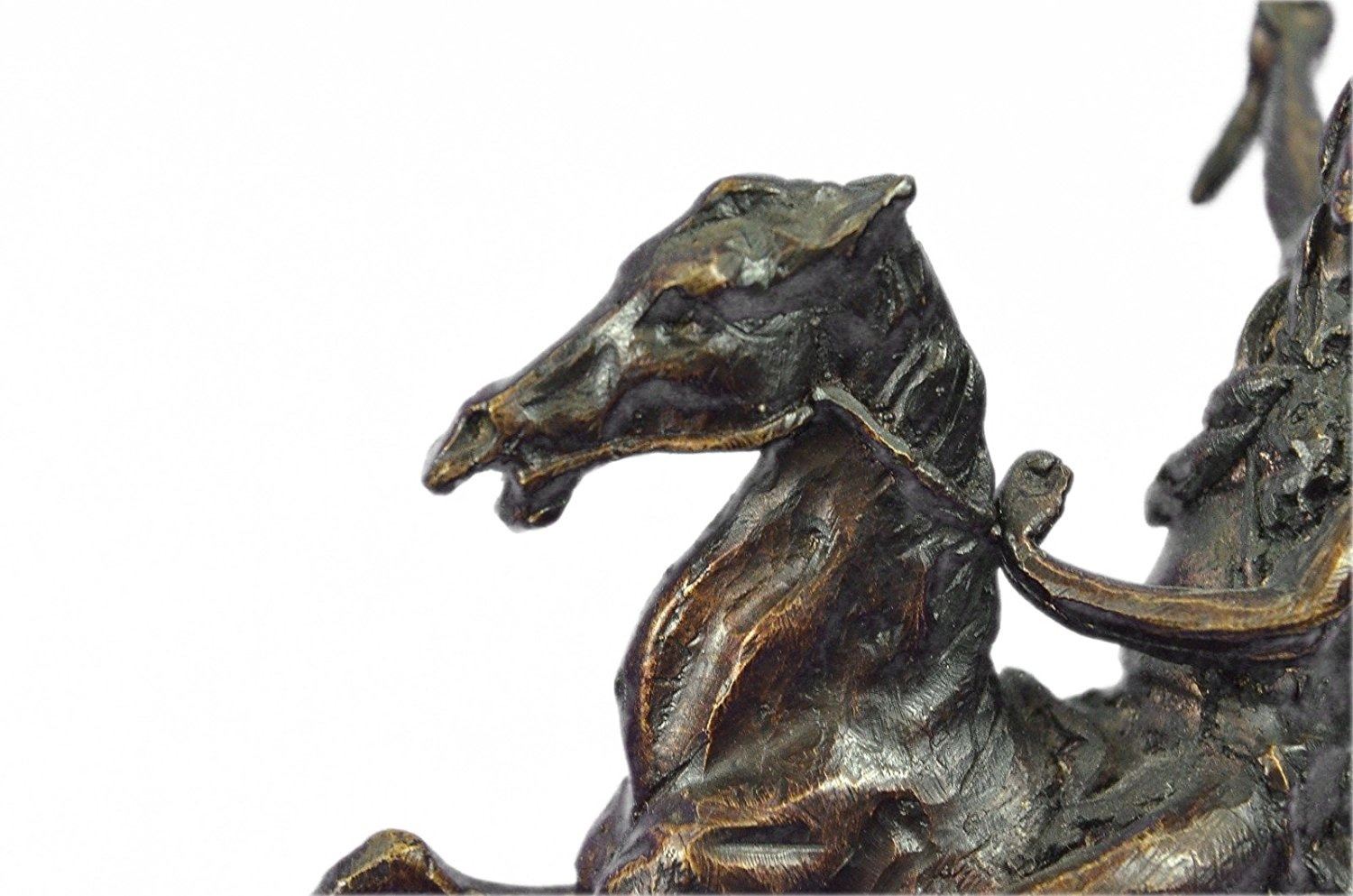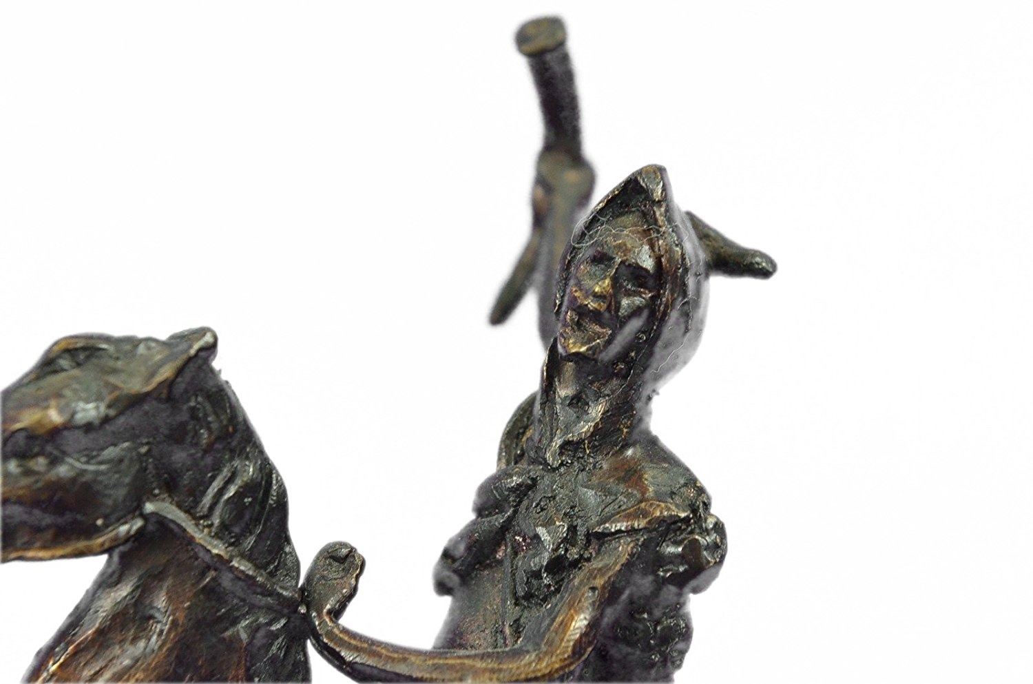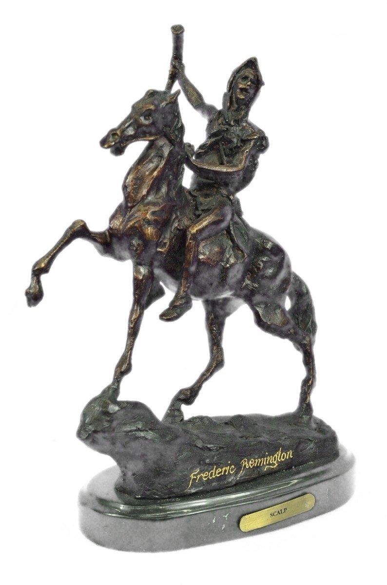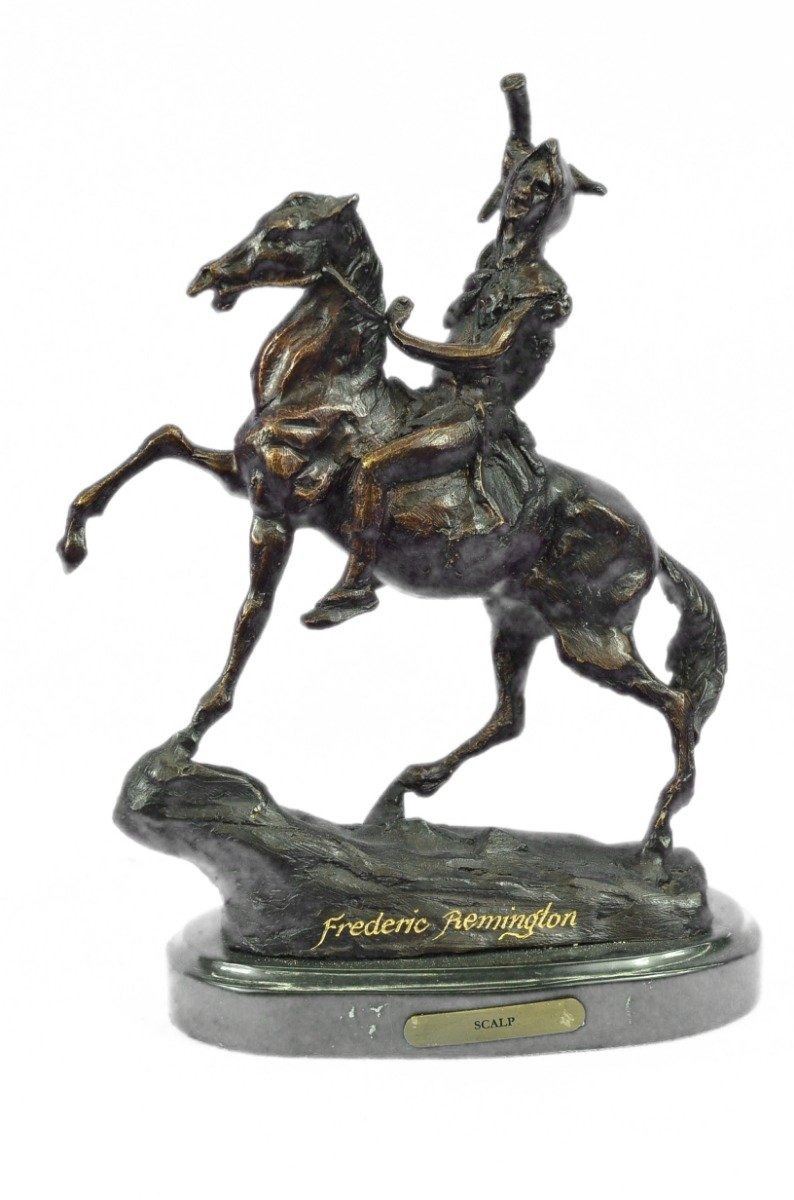 Proud, resilient, strong and a fierce warrior, this Native American watches over his land and tribe. Great attention to detail was paid to his clothing. Most Indian men did not use shirts, but he wears a breech cloth- a long rectangular piece of hide or cloth tucked over his belt, which hangs in the front and back. He also wears moccasins. Mounted on his horse, he turns his head toward the sky and holds up a feather. His gaze is almost pleading. 100% bronze and fully handmade, this carefully detailed sculpture is in a two-toned brown patina and was cast using the Lost Wax Method and mounted on a marble base. Bronze Dimensions with Marble Base: Height 10 X Width 9 inches. Weight: 7 LBS. Inventory: 39-631004593