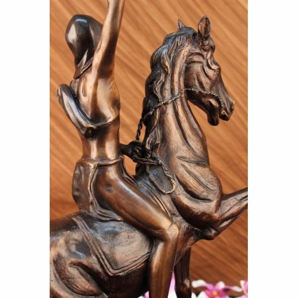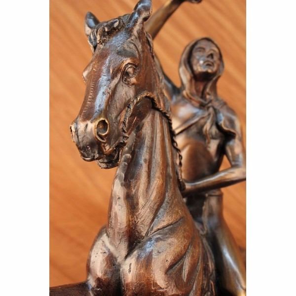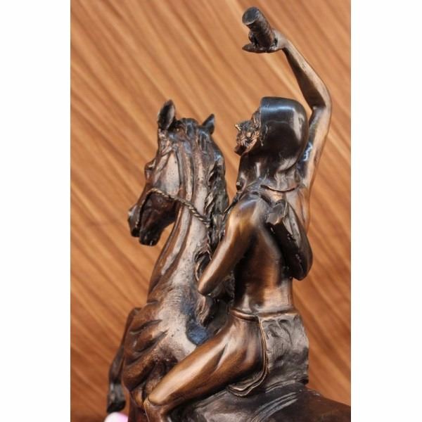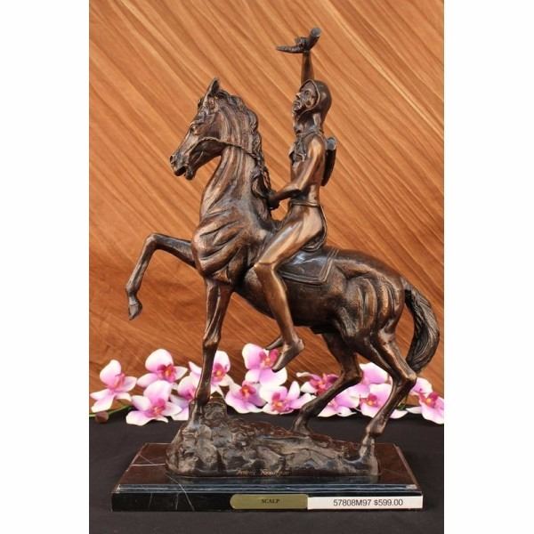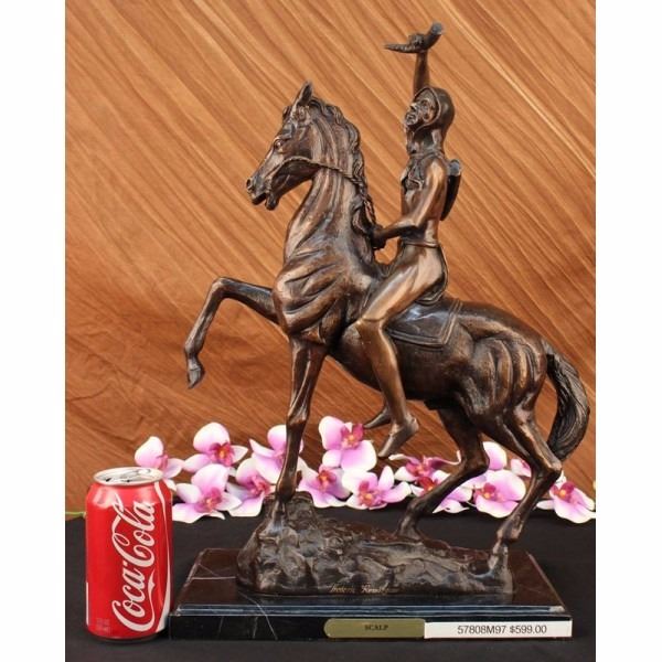 A proud Indian gallops atop his horse, returning home with evidence of his own battle in the desert. He sits high and thrusts a scalp into the air. His long silky hair falls down the line of his back and he wears only a loincloth around his waist. This two toned brown patina sculpture was cast using the lost wax method and mounted on a black marble base. Bronze dimensions with marble base: Height 19 X Width 21 inches. Weight: 22 lbs. Please Note: This is a reproduced bronze sculpture from the original molded and signed. This featured bronze sculpture is a recast after the original, and has been done recently. This 100% bronze sculpture is an abstract piece certain to be a conversation piece.