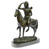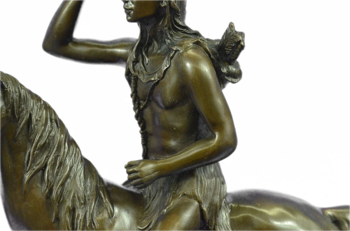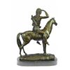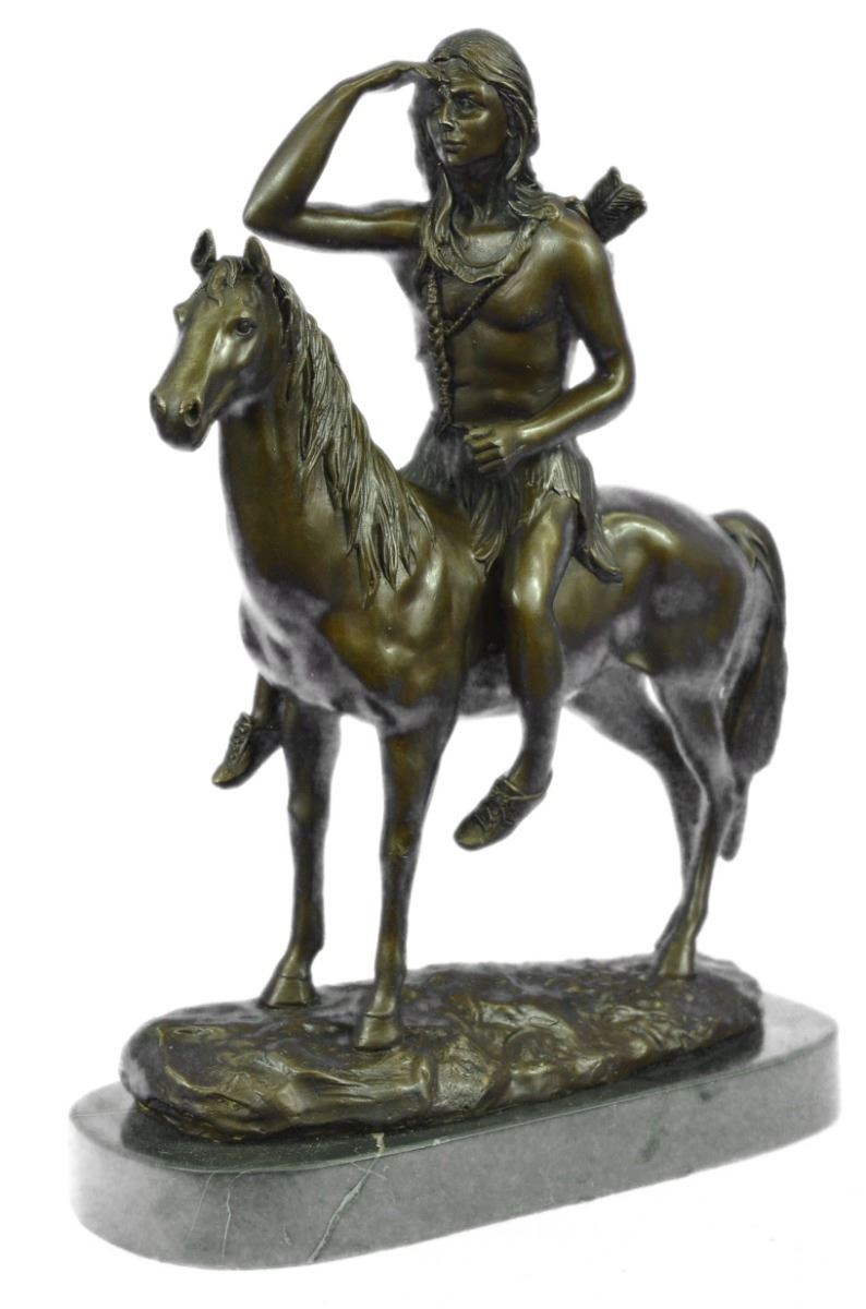This Impressive Sculpture By Western Sculptor Cyrus Edwin Dallin (American, 1861-1944) Depicts A Noble Native American Warrior Atop His Horse, With His Hand Shading His Eyes As He Scans The Horizon. Please Click On The Thumbnail Images Above To See Additional Views, And Then Click On Any Image To Enlarge It. We Have Cast The Scout In Our Own European Art Foundry Using Genuine Pure Bronze. The Sculpture Is Finished With A Gorgeous Patina In Tones Of Brown. Mounted Onto A Black Marble Base. Bronze Dimensions With Marble Base: Height 14 X Width 11 inches. Weight: 17 Lbs. This Is Not An Original Of His Work But A Recent Reproduction.