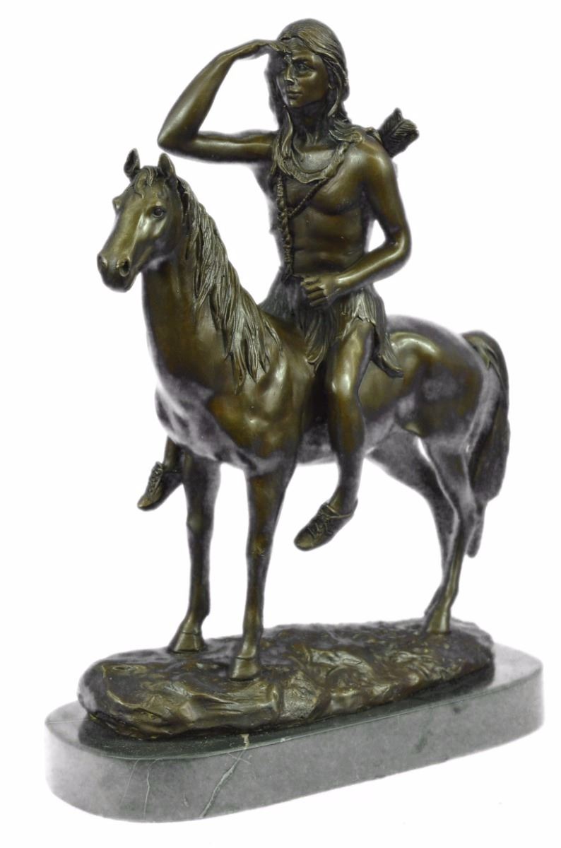 This Impressive Sculpture By Western Sculptor Cyrus Edwin Dallin (American, 1861-1944) Depicts A Noble Native American Warrior Atop His Horse, With His Hand Shading His Eyes As He Scans The Horizon. Please Click On The Thumbnail Images Above To See Additional Views, And Then Click On Any Image To Enlarge It. We Have Cast The Scout In Our Own European Art Foundry Using Genuine Pure Bronze. The Sculpture Is Finished With A Gorgeous Patina In Tones Of Brown. Mounted Onto A Black Marble Base. Bronze Dimensions With Marble Base: Height 14 X Width 11 inches. Weight: 17 Lbs. This Is Not An Original Of His Work But A Recent Reproduction.FT020FT020