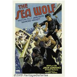 <B>The Sea Wolf (Fox Films, 1930)</B></I> One Sheet (27" X 41"). Silent film idol Milton Sills stars as the psychotic Wolf Larsen in this 1930 screen version of Jack London's famous tale. Actually the studio was afraid that the role of the heinous captain would harm Sills reputation so they split the role of the captain into two parts. Sills played a less vicious Wolf Larsen, while Mitchell Lewis plays his diabolical brother and co-skipper Death Larsen. This graphically intense one sheet features outstanding stone litho graphics. There is fold line wear with paper loss at the upper crossfold, edge wear, and pinholes. The poster has been professionally restored and displays very well. Fine/Very Fine on Linen.