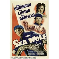 <B>The Sea Wolf (Warner Brothers, 1941)</B></I> One Sheet (27" X 41"). Based on Jack London's novel and directed by Michael Curtiz, this film stars Edward G. Robinson as Captain Wolf Larsen, a tyrannical leader that rules his ship, the "Ghost", with an iron fist, showing no mercy to anyone. Larsen's motto is "Better to reign in Hell than serve in Heaven", a line borrowed from Milton's "Paradise Lost." Writer Humphrey Van Weyden (Alexander Knox) along with fugitive Ruth Brewster (Ida Lupino) and sailor George Leach (John Garfield) find themselves imprisoned aboard the doomed vessel and frantically search for away to escape. There is fold line wear with some separation, several pinholes in the corners and borders, small tears, and one extra fold line across the top border. Fine.
