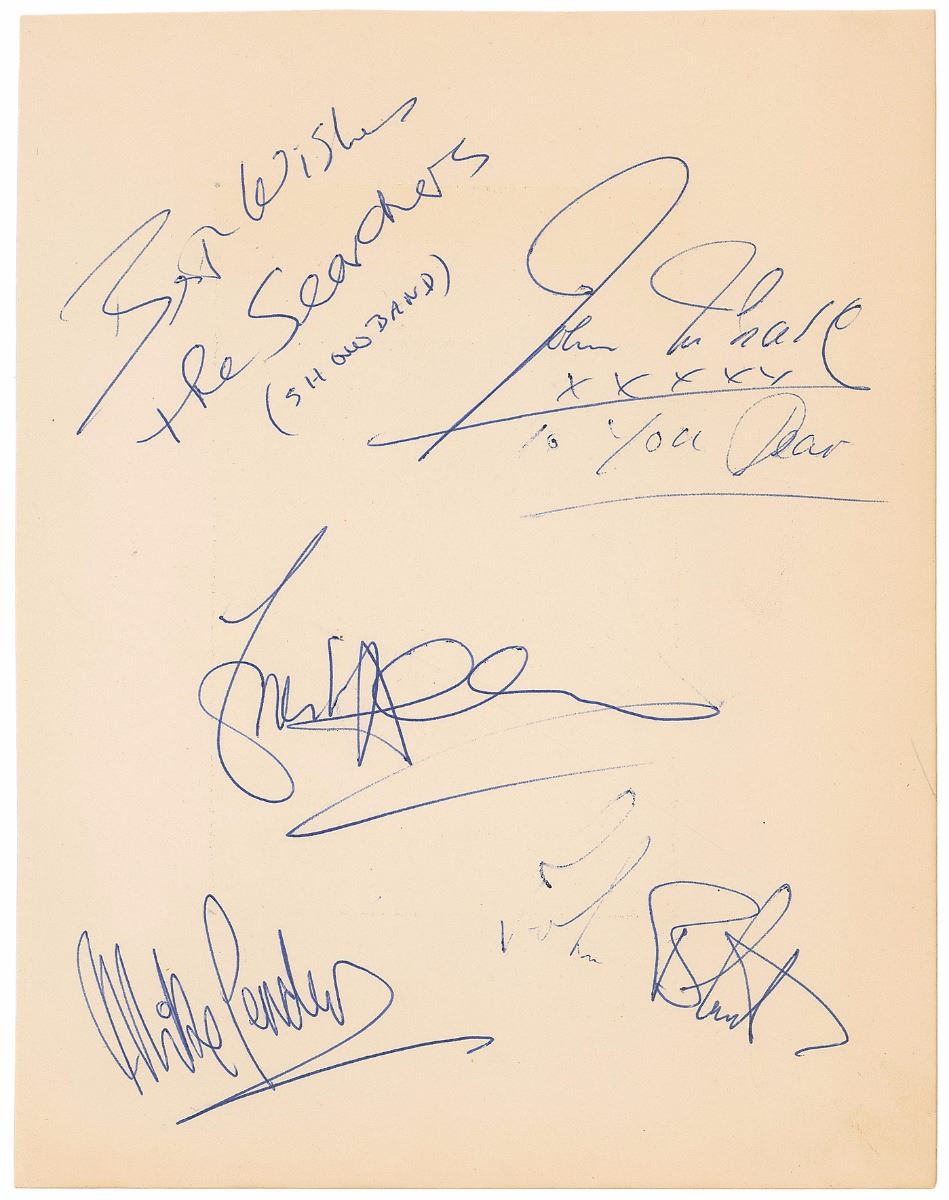 Ballpoint signatures, “Mike Pender,” “Frank Allen,” “John Blunt,” and “John McNally, XXXXX, to you dear,” on an off-white 6.75 x 8.75 sheet, inscribed at the top in an unknown hand, “Best wishes, The Searchers, (showband).” In fine condition, with evenly trimmed edges, and skipping to Blunt’s first name.