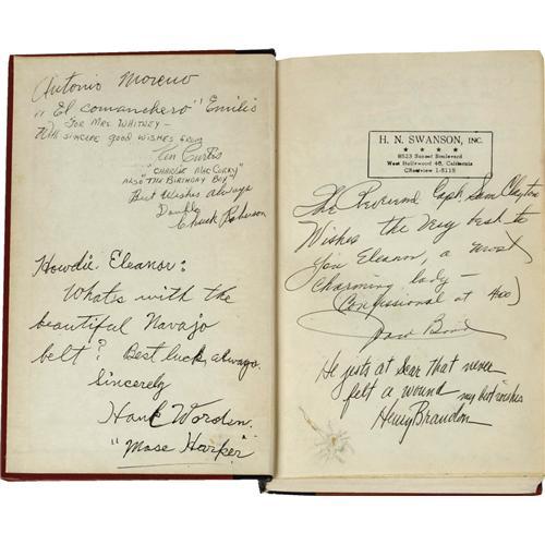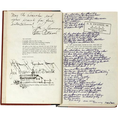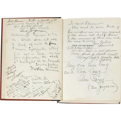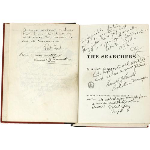 <B>"The Searchers" Signed First Edition (Curtis Publishing, 1954).</B></I> Deemed "culturally significant" by the Library of Congress and selected for preservation in the U. S. National Film Registry, director John Ford's "The Searchers" is hands down one of the greatest American films ever made, and often named as a source of inspiration by the likes of Martin Scorsese, Steven Spielberg, Sam Peckinpah, and George Lucas (who made numerous visual and narrative references to it in his <I>Star Wars</B></I> films). This first edition copy of Alan LeMay's novel was kept handy on the set during filming by an extra, and was signed by the virtually the entire cast and crew. Included are signatures from Ford, actors John Wayne, Vera Miles, Natalie Wood, Harry Carey Jr., Ward Bond, and Ken Curtis -- each of whom signed their character names as well as their own, making this exceedingly rare and unique. Producer Patrick Ford, art director James Basevi, production manager Lowell Farrell, stunt double Terry Wilson, and the Native American actors (many including thumbprints) have also signed. For the disscriminating film collector, it does not get better than this! A one-of-a-kind piece of Hollywood history, the book is in overall Very Good condition with some light wear to the spine, no dustjacket, and some separation starting to show on the inside back cover, none of which detracts from this very desirable item. <I>With COA from PSA/DNA.</B></I>