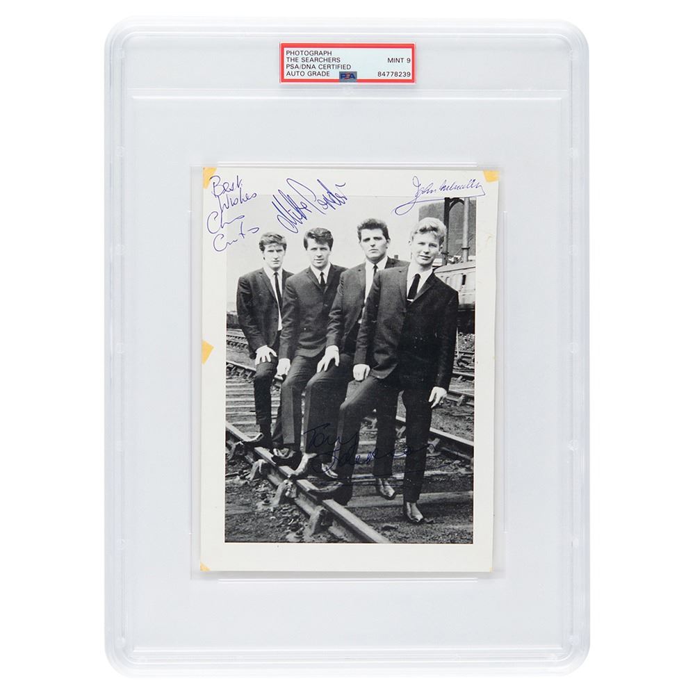 Vintage semi-glossy 5.75 x 8 cardstock photo of The Searchers posing on railroad tracks, signed in blue ballpoint, "Best wishes, Chris Curtis," "Mike Pender," "Tony Jackson," and "John McNally." In fine condition, with small pieces of old tape to the edges. Encapsulated and graded by PSA/DNA as "MINT 9."