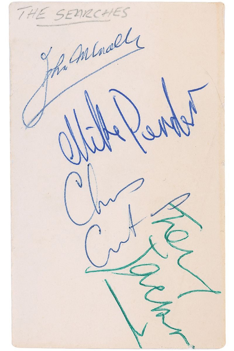 Vintage ballpoint signayures of Mike Pender, John McNally, Chris Curtis, and Tony Jackson, on an off-white 2.5 x 4.5 sheet, with a collector’s notation along top edge. In fine condition, with some scattered light creases. Accompanied by an original Searchers promotional photo and a certificate of authenticity from Tracks.