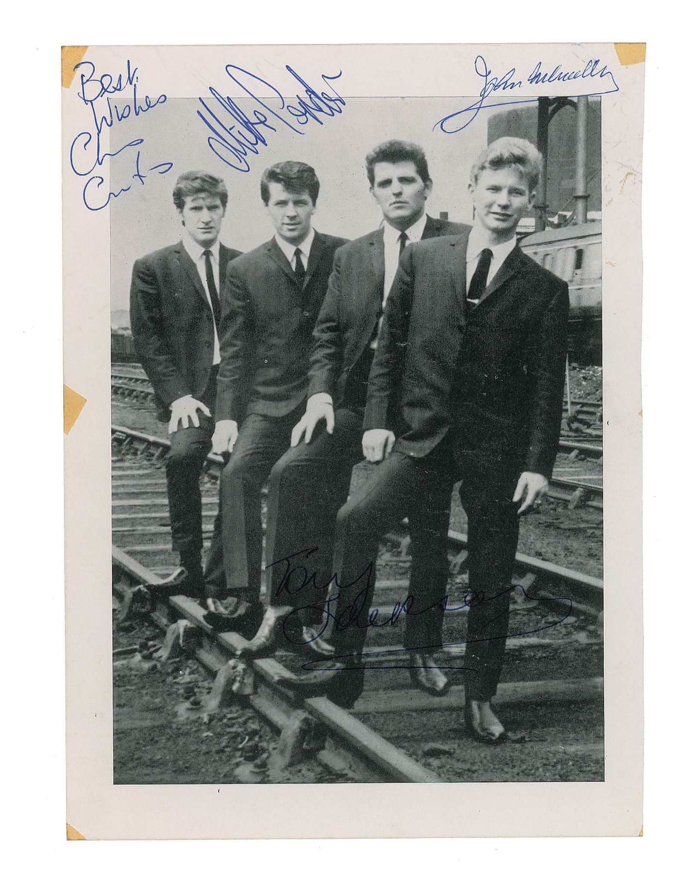 Glossy 5.75 x 8 cardstock photo of The Searchers posing on railroad tracks, signed in blue ballpoint, "Best wishes, Chris Curtis," "Mike Pender," "Tony Jackson," and "John McNally." In fine condition, with small pieces of old tape to the edges.