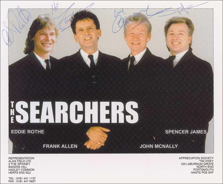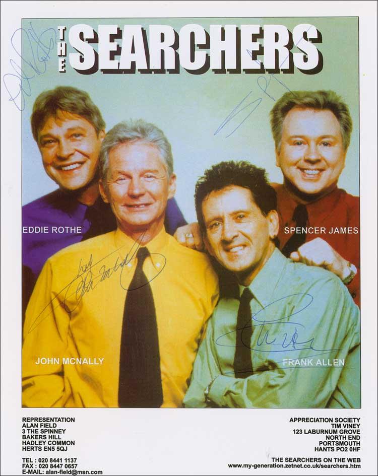 Two different color photos, one 8 x 10 and one 10 x 8, each signed in blue ballpoint by all four members: Eddie Rothe, Frank Allen, John McNally, and Spencer James. In fine condition, with a few light edge creases to one photo. RRAuction COA.