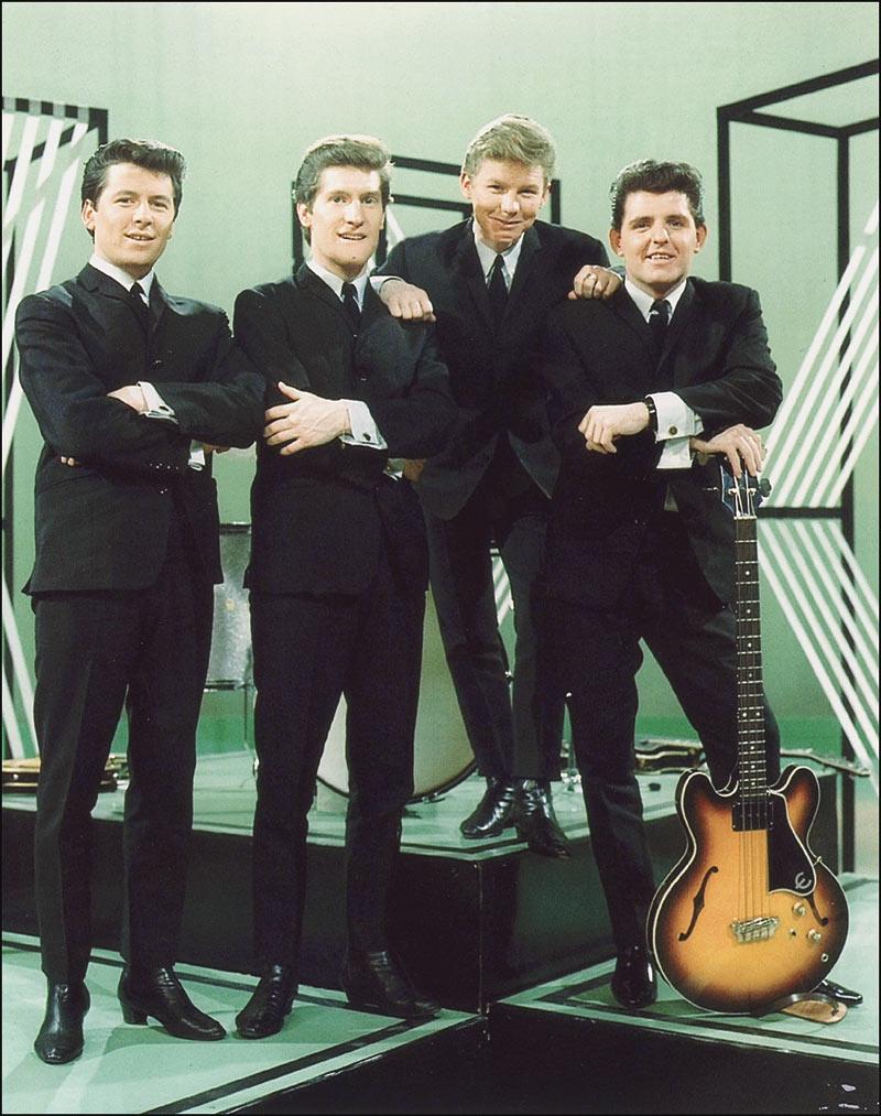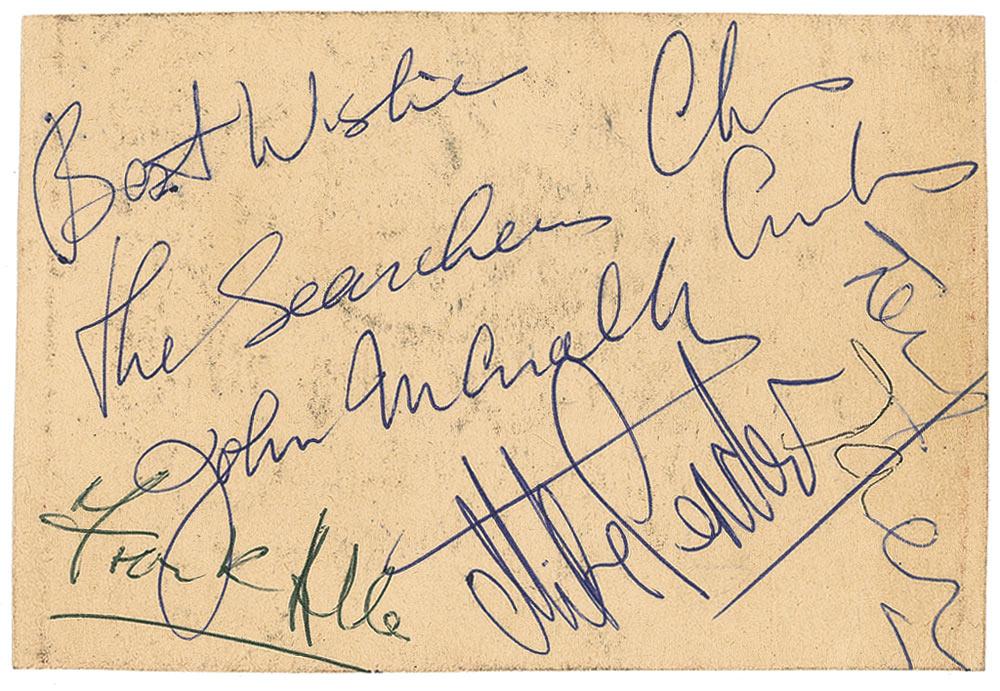 Vintage ballpoint signatures of original members Mike Pender, John McNally, Frank Allen, Chris Curtis, and Tony Jackson on an off-white 4.25 x 3 card, with McNally adding “Best wishes, The Searchers.” Scattered light toning and soiling, otherwise fine condition.
