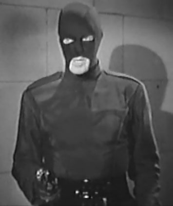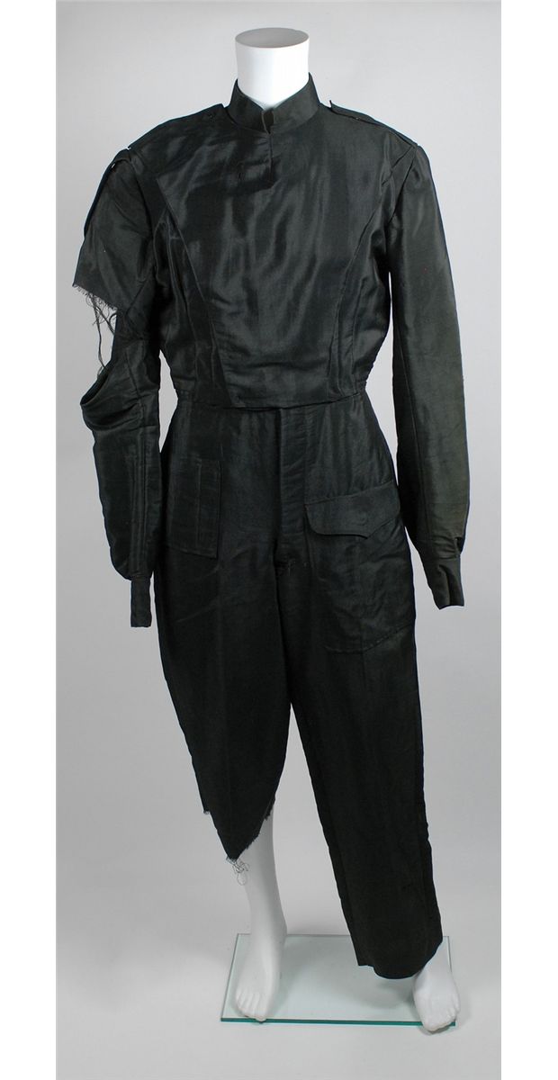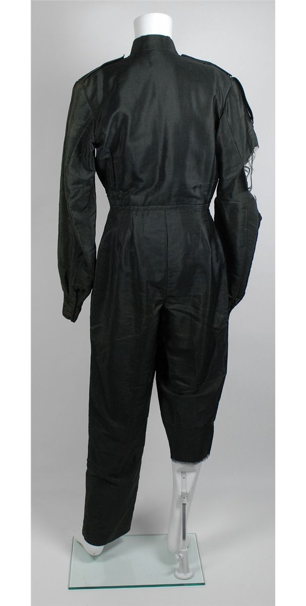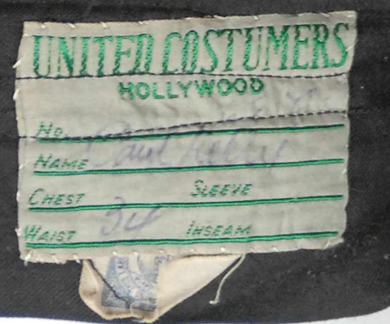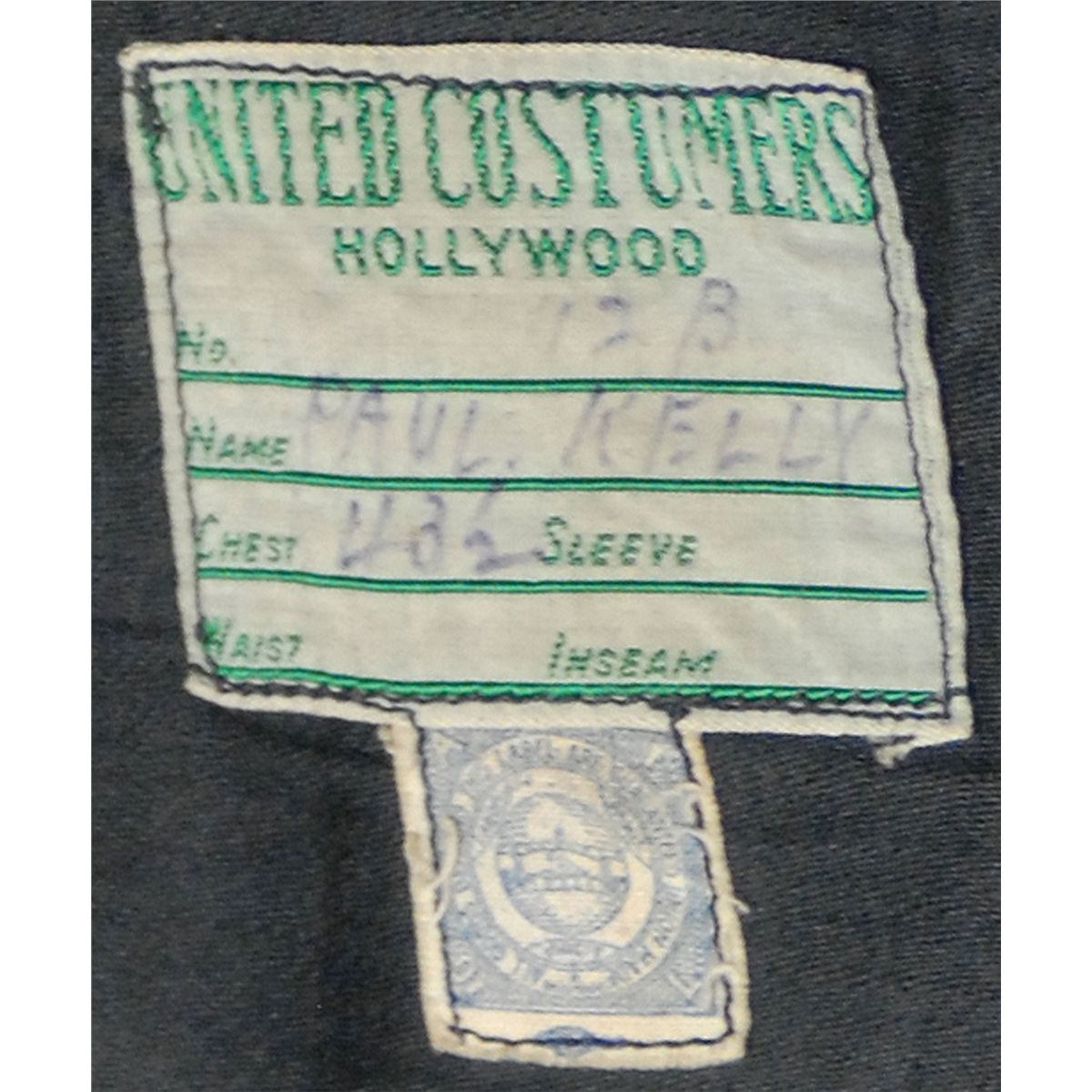 Costume worn by Kelly as the 'Black Commando' in the Columbia spy serial The Secret Code. One-piece black jumpsuit has a button-up front, with United Costumers and Warner Bros. labels sewn into the lining. The lower right leg is missing, as well as having a hole to one arm. In fine condition, with aforementioned distress. This serial is considered Columbia's best and one of the top rated overall. Accompanied by a 1953 re-issue of a lobby card for Chapter 3 of The Secret Code.