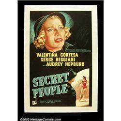 The Secret People, (Lippert, 1951). One Sheet (27"X41") Small British made movie in which Audrey Hepburn makes her film debut. Very Fine on Linen. Important notice: We expect to be auctioning lots at the rate of 200-250 per hour. Sometimes eBay Premier live bid software cannot keep up with that pace, so we strongly recommend that you place a realistic proxy bid now as insurance to avoid disappointment. Also please note that all Heritage/CAA lots purchased through eBay Premier carry a 20% Buyer's Premium.