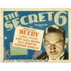 <B>The Secret Six (MGM, 1931)</B></I> Title Lobby Card (11" X 14"). During the early 1930's, Hollywood sensationalized the crimes being played out in Chicago and New York by the likes of Al Capone and Lucky Luciano. Wallace Beery was frequently cast as a gangster in these types of films and in "The Secret Six" he takes over a gang until a commission of six business men have him prosecuted. The film also starred newcomers Jean Harlow and Clark Gable. This title card is extremely scarce and in fact, any material on this elusive title is very rare. The card has several pin-holes in each corner. Fine/Very Fine condition.