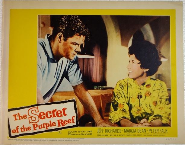 The Secret of the Purple Reef (Associated Producers, 1960) lobby card. Drama, Crime. Starring Jeff Richards, Margia Dean, Peter Falk, Richard Chamberlain, Terence de Marney, Robert Earl Jones, Gina Petrushka, Larry Markow, Philip Rosen, Frank Ricco, Jerry Mitchell. Directed by William Witney. Near Mint. (11"x14").