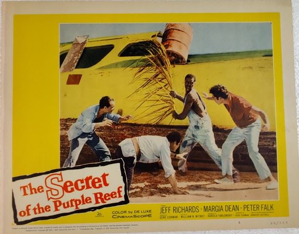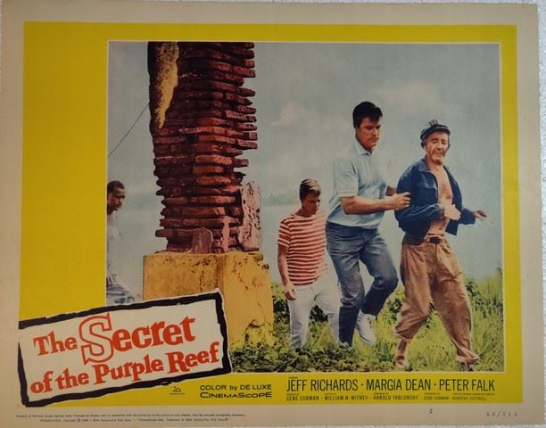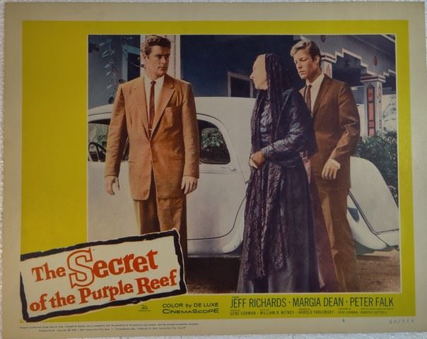 The Secret of the Purple Reef (Associated Producers, 1960) lobby card. Drama, Crime. Starring Jeff Richards, Margia Dean, Peter Falk, Richard Chamberlain, Terence de Marney, Robert Earl Jones, Gina Petrushka, Larry Markow, Philip Rosen, Frank Ricco, Jerry Mitchell. Directed by William Witney. Near Mint. (11"x14").