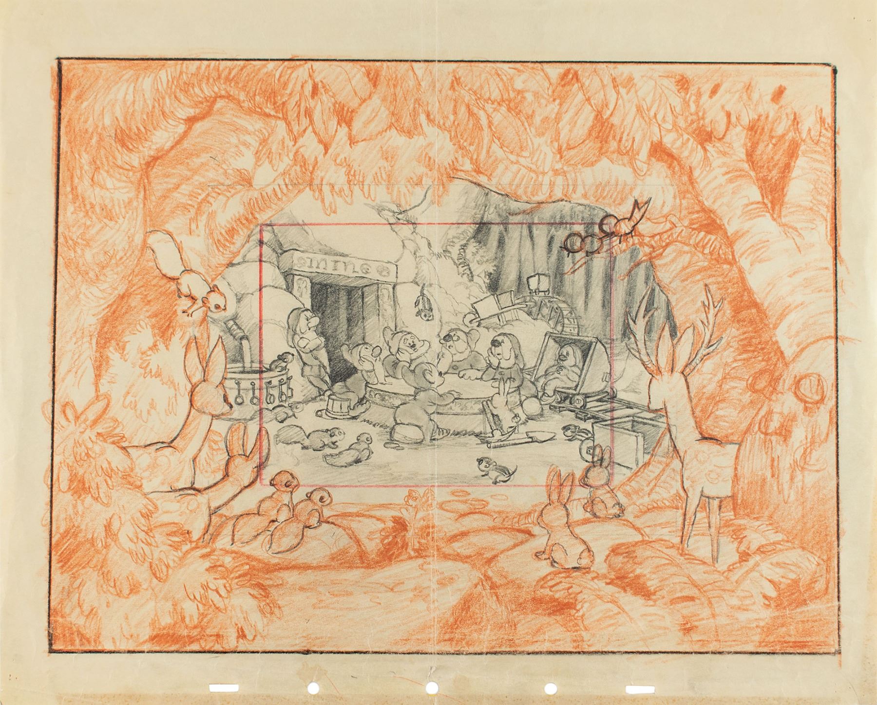 (Walt Disney Studios, 1937) Remarkably detailed original 16-field concept layout drawing from Snow White and the Seven Dwarfs, which depicts the dwarfs conversing in front of the diamond mine on how best to build a bed for Snow White. The central image of the dwarfs at the table is accomplished in graphite, with the surrounding forest and woodland creatures achieved in orange sepia-tone pencil, indicating that it would be hand-painted on glass for the multi-plane camera to move through. The drawing is on untrimmed 14.75 x 12 animation paper, with the total image measuring 13.25 x 10. In very good to fine condition, with a horizontal fold, some creasing and toning to edges, and pin holes to corners. The 'bed building' scene in Snow White was ultimately removed from the final version of the film as Walt Disney thought it detracted too much from the main good-vs-evil story arc between the Queen and Snow White. An extremely rare, one-of-a-kind, and gorgeously rendered 'lost scene' from Disney's first full-length animated feature film.