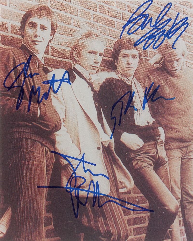 Glossy 8 x 10 photo of the Sex Pistols posing against a brick wall, signed in blue felt tip by Glen Matlock, Paul Cook, Johnny Rotten, and Steve Jones. In fine condition, with slightly grainy image quality. Brennan recalls in-person encounters with the Sex Pistols' Johnny Rotten: "he is way nicer than he comes across. Yeah, he could be surly, but generally very affable." Accompanied by a John Brennan Collection letter of provenance.
