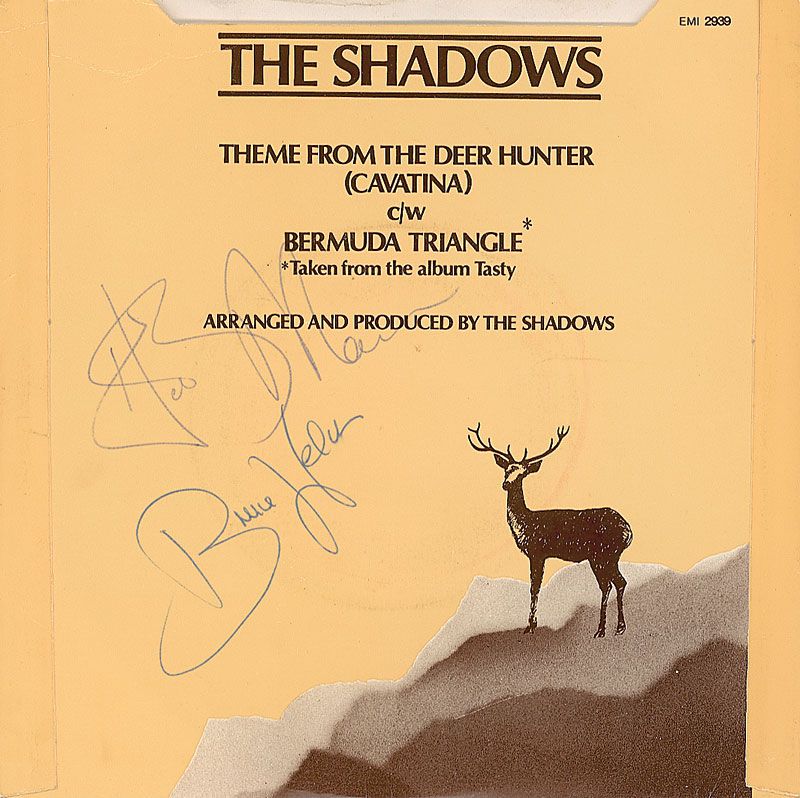 Color 45 rpm record sleeve for ‘Theme from the Deer Hunter (Cavatina),’ signed on the back cover of the sleeve in blue ballpoint by Hank Marvin and Bruce Welch. In fine condition, with a mild album impression to back cover. Accompanied by a full letter of authenticity from Roger Epperson/REAL.