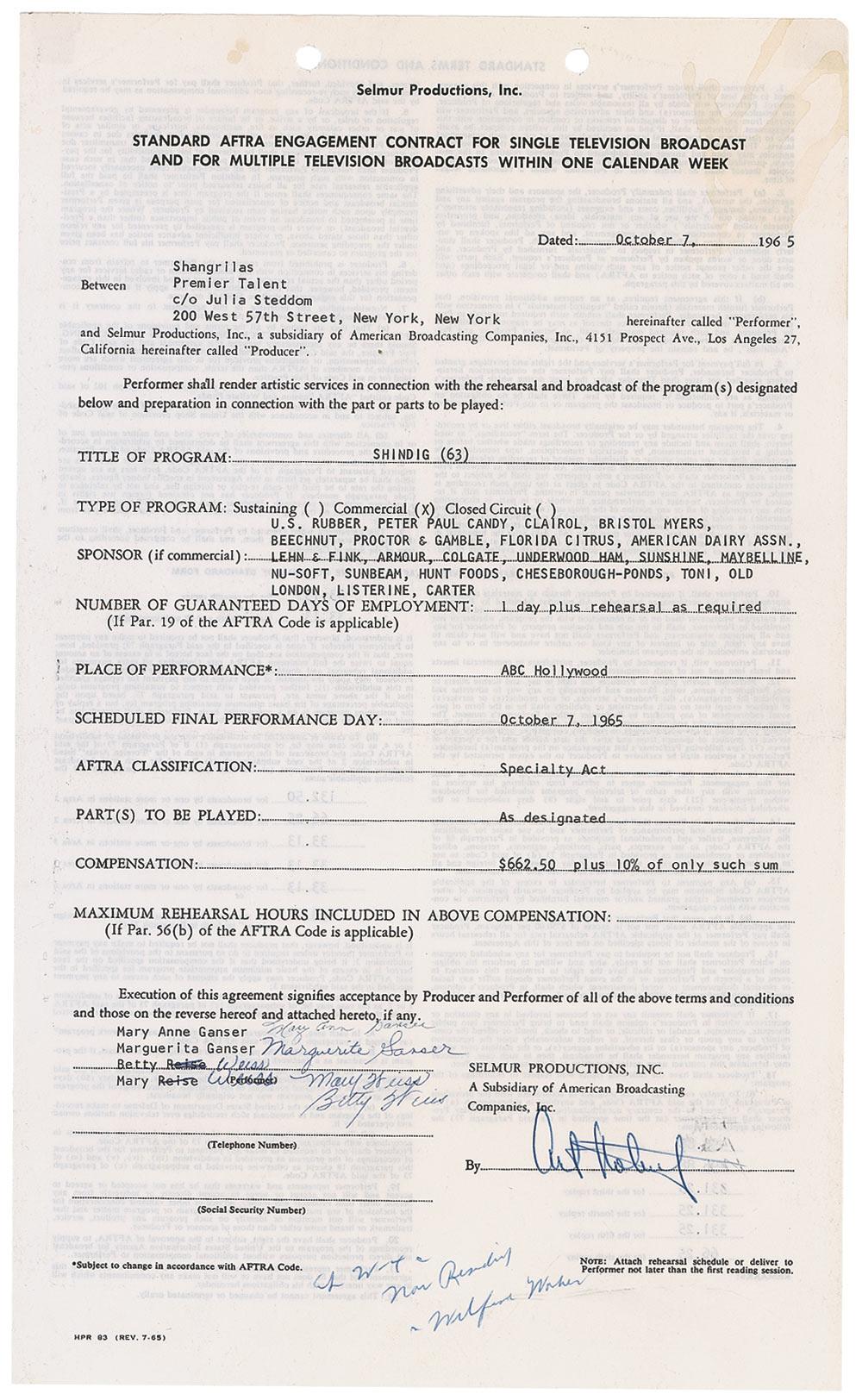 Pop group consisting of two sets of sisters, best-known for the songs “Leader of the Pack” and “Remember (Walkin’ in the Sand).” Partly-printed DS, two pages both sides, 8.5 x 14, October 7, 1965. An AFTRA engagement contract related to the appearance of The Shangri-Las on the television show Shindig. Signed in blue ballpoint by Mary Ann Ganser, Marguerita Ganser, Betty Weiss, and Mary Weiss. In fine condition, with staple holes to left side, two standard filing holes at top border, and some light staining at the top right corner. Pre-certified Roger Epperson/REAL and RRAuction COA.