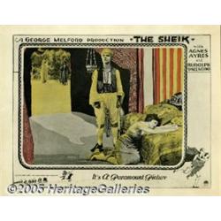 <B>The Sheik (Paramount, 1921).</B></I> Lobby Card (11" X 14"). The dashing Rudolph Valentino stands forlorned as the lovely Agnes Ayres refuses his amorous advances. This is the film that catapulted Valentino into International stardom and forever galvanized his reputation as the silent eras famed "Latin Lover" of the silver screen. There are pinholes in the corners and borders, otherwise this card is in excellent condition. Very Fine+.
