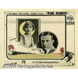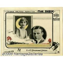 <B>The Sheik (Paramount, 1921).</B></I> Lobby Card (11" X 14"). This card displays studio portraits of the two stars that appeared in this romantic adventure film, Rudolph Valentino and Agnes Ayres. This is the film that launched Valentino to international stardom as the dark and handsome "Latin Lover" of the silent era. There are corner and border pinholes, otherwise this card is pristine. Very Fine+.