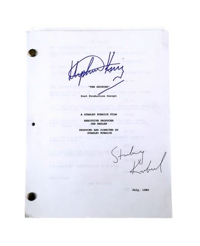 From the classic feature film The Shining (1980) starring the infamous Jack Nicholson and directed by the great director Stanley Kubrick and written by award winning Stephen King is a post production screenplay from the production autographed by both Stanley Kubrick and Stephen King. This is an amazing collectible from this world classic film. Measures approximately 11 1/2" x 8 1/2")