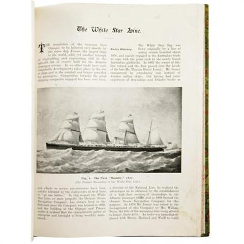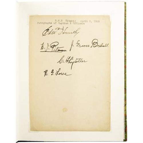 <B><I>The Shipbuilder: "Olympic" and "Titanic"</B></I></B></I> <B>with Signed Sheet by Five <I>Titanic</B></I></B></I> <B>Officers Mounted In</B></I> (Shipbuilder Press, 1911), first edition, 130 pages, rebound in marbled paper boards shelf backed in green cloth with gilt titles, 8vo (7.5" x 9.75"). A signed sheet has been mounted in with mounting corners on the front free endpaper. The sheet is titled "R. M. S Titanic April 2, 1912 Autographs of Captain & Officers" and signed "<I>Edward J Smith</B></I>", "<I>H. J. Pitman</B></I>", "<I>C. H. Lightholler</B></I>", "<I>H. G. Lowe</B></I>" and "<I>J. Groves Boxhall</B></I>". Smith was the captain of the <I>Titanic,</B></I> perishing in its sinking when he refused to abandon the ship. Herbert John Pitman was the Third Officer of the <I>Titanic.</B></I> Charles Herbert Lightholler was the most senior member of the <I>Titanic</B></I> to survive. He was later awarded the Distinguished Service Cross in 1916 for his service in World War I. Harold Godfrey Lowe was the Fifth Officer, in charge of Lifeboat 14 after the <I>Titanic</B></I> hit an iceberg and sank in the middle of the Atlantic Ocean. Lowe's lifeboat was the only one to return to the site of the wreckage to search for survivors. Joseph Groves Boxhall was the Fourth Officer, and later served as a naval officer in World War I. All five men have signed boldly on the sheet inside this book, which includes a fold-out map of the original schematics of the ship. The book is in fine condition. The signed sheet is in near fine condition, with some toning to the page. A rare chance to obtain signatures of five officers who commanded the infamous first and last voyage of the <I>Titanic</B></I>.<BR><BR><b>Shipping:</b> Books & Catalogs (<a target="_blank" href="http://www.heritageauctions.com/common/shipping.php">view shipping information</a>)