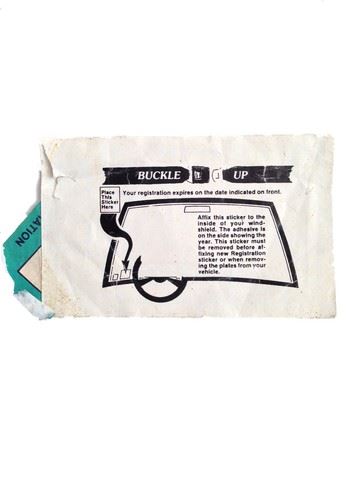 THE SHIPPING NEWS - NY Vehicle Registration - A studio-distressed yellow window sticker, measuring 5 1/2” x 3 1/8”, representing New York State Vehicle Registration and dated 12/01. The decal is torn and aged with designer dirt. Ideal for display, this is a rare and unique MIRAMAX movie prop!!