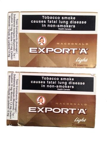 THE SHIPPING NEWS - Tert Card's (PETE POSTLETHWAITE) Cigarette Boxes - These two empty cigarette boxes are from a Canadian brand called “Export A.” The rectangular, 4” x 2 7/8” boxes have no top or bottom, and once held 25 “Light” cigarettes. Ideal for display, these authentic MIRAMAX props are a genuine piece of film history!!