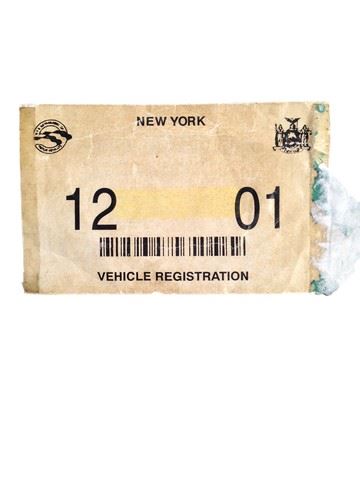 THE SHIPPING NEWS - NY Vehicle Registration - A studio-distressed yellow window sticker, measuring 5 1/2” x 3 1/8”, representing New York State Vehicle Registration and dated 12/01. The decal is torn and aged with designer dirt. Ideal for display, this is a rare and unique MIRAMAX movie prop!!