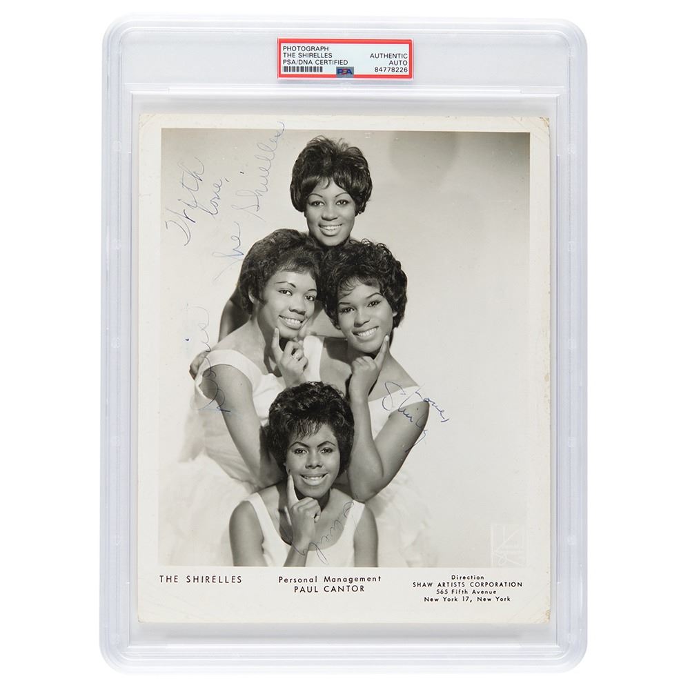 Vintage glossy 8 x 10 publicity photo of the Shirelles by the James J. Kriegsmann Studio, signed in ink, "With love, the Shirelles, Doris [Coley]," "Love, Shirley [Owens]," and "Beverly [Lee]." In very good to fine condition, with scattered light creasing. Encapsulated in a PSA/DNA authentication holder.