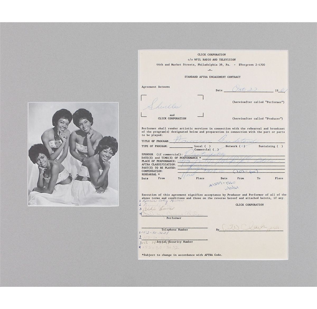 DS, one page, 8.5 x 11, Click Corporation letterhead, October 27, 1961. The Shirelles agree to appear on American Bandstand for the sum of $408.00, at 102.00 per member. Signed at the bottom in ballpoint by all four members: Doris Coley Kenner, Beverly Lee, Addie Harris and Shirley Owens Alston. Also signed by Dick Clark. Matted with a nice group photo to an overall size of 16.25 x 13.5. In fine condition, with three of the signatures a shade or two light, but still completely legible.