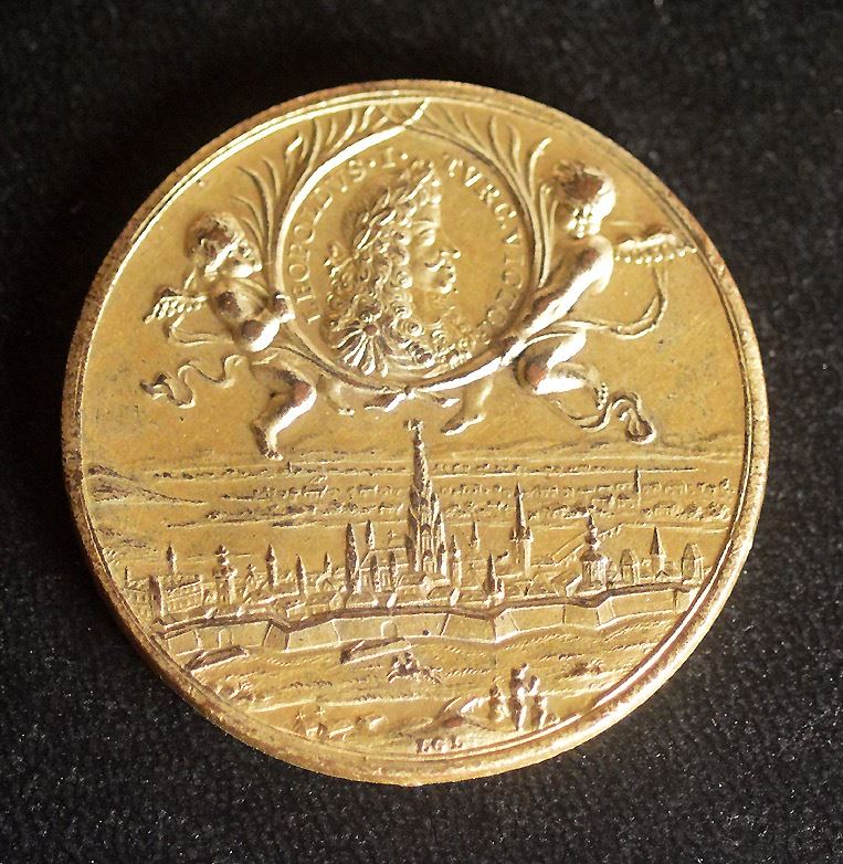 medallic bust of the Emperor over Vienna cityscape, "LEOPOLDVS I TVRC VICTOR"; Rev: scenes of the