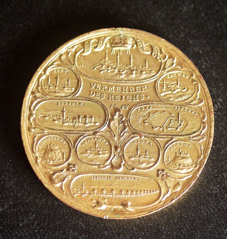 victories in ten vignettes, "VERMEHRER DES REICHS, 1686"; Ae, gilt, About VF, edge nicks, by Lazarus Gottlieb Lauffer. (Mont 973; Julius 258; Ciech 38; ANS [1910] 46; BDM VI, 358; Serenissma 254)
