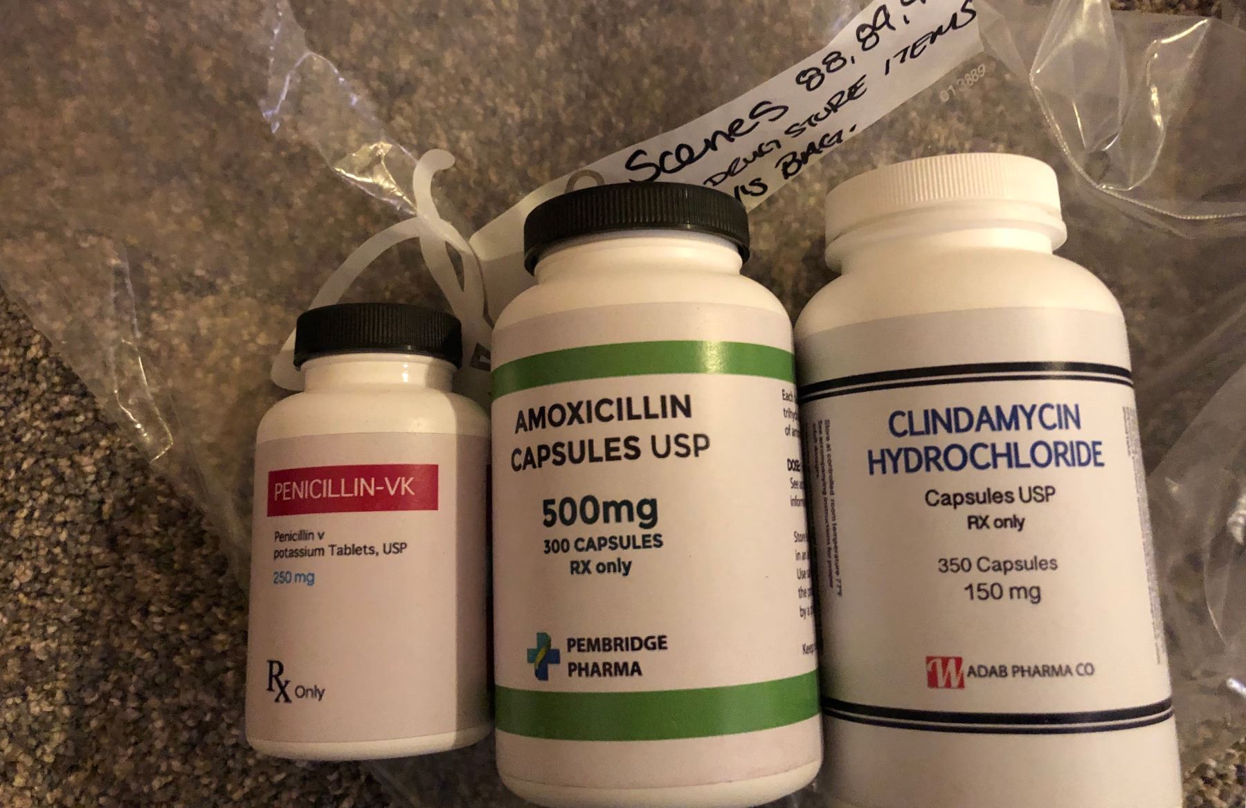 Description: Hero bottles of various drugs made for production as pictured, bottles are empty. Used in various parts of the film. These are used to save the life of Miranda Otto as the mother. There are 6 bottles with made up labels on the outside.