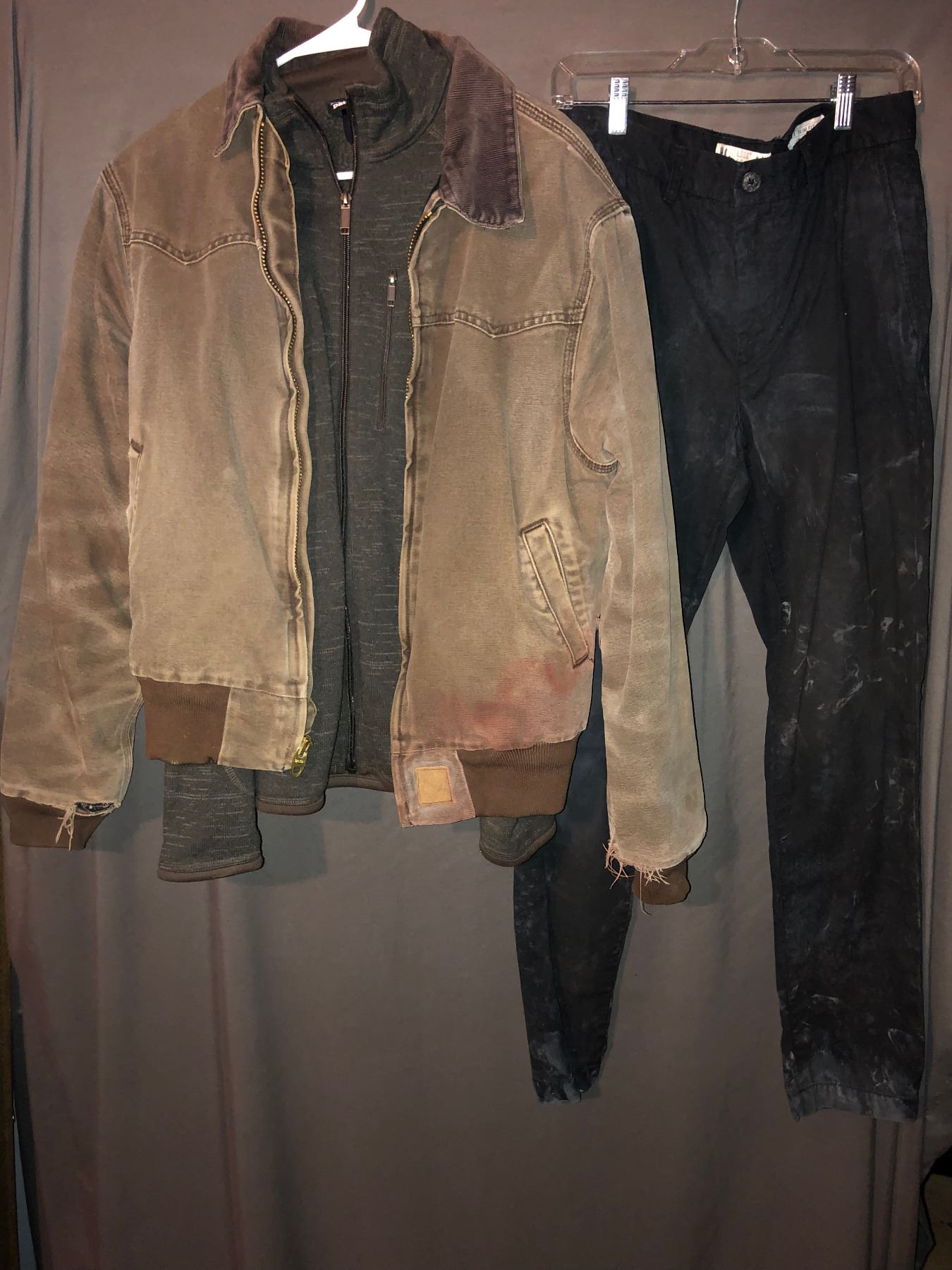 Description: A multi piece costume consisting of Carhartt jacket with blood stains, trousers, and undershirt. This type of outfit was worn throughout most of the middle section of the Netflix film.