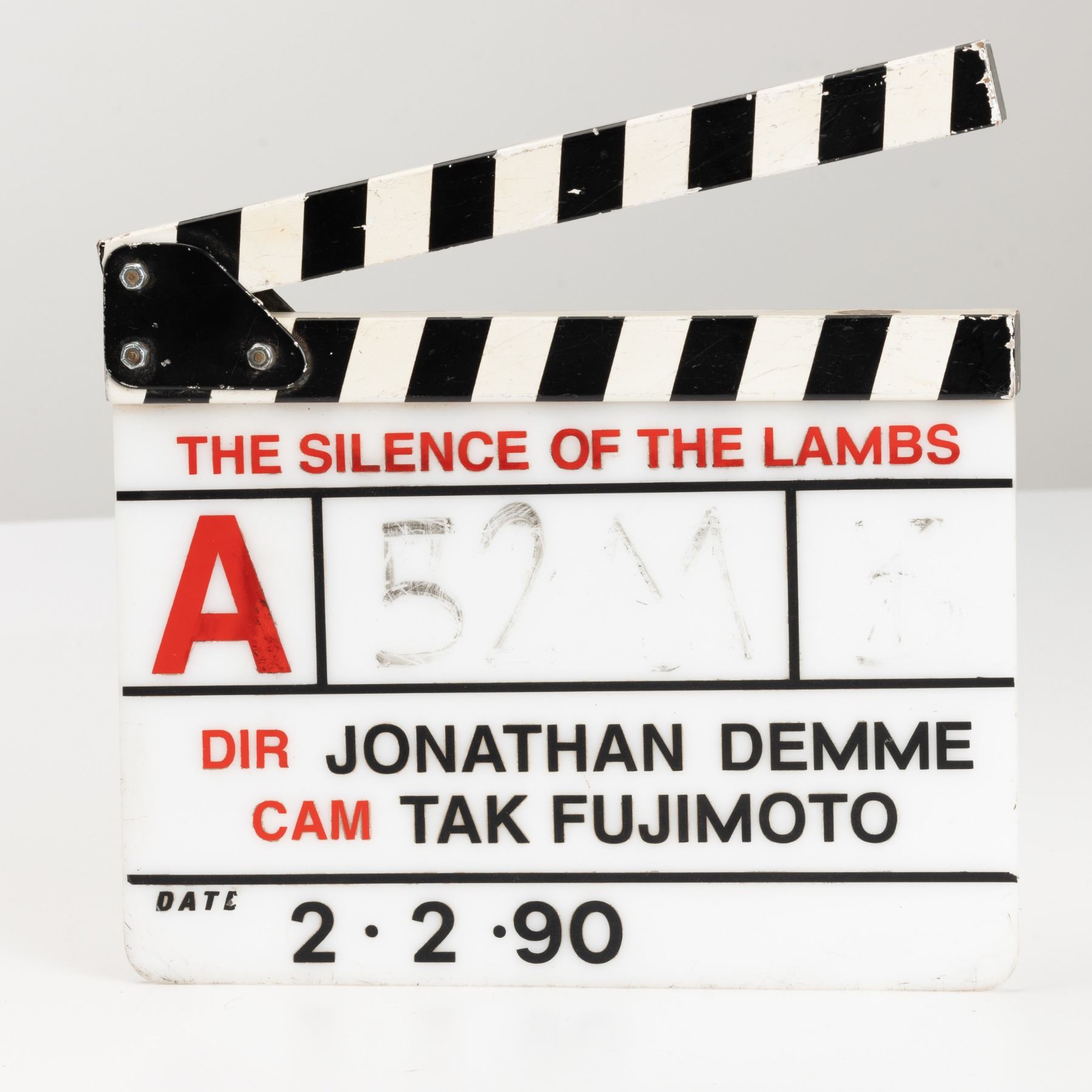 The clapperboard consists of an acrylic slate with a wooden clapper fixed to the top. The film’s title, “The Silence of the Lambs” runs along the top, and the film’s Director, Jonathan Demme, and the film’s cinematographer, Tak Fujimoto, are outlined in black just at the bottom of the slate.