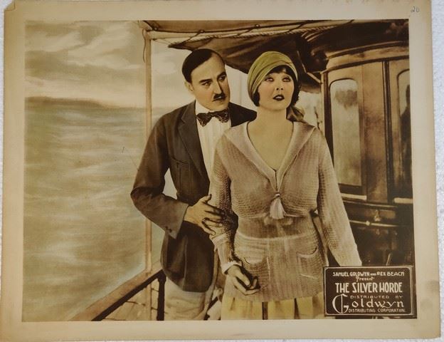 The Silver Horde (Samuel Goldeyn & Rex Beach, 1920) lobby card. Adventure, Drama. Starring Myrtle Stedman, Curtis Cooksey, Betty Blythe, R.D. MacLean, Robert McKim. Directed by Frank Lloyd. Some edge wear, minor creases, minor stains. Very Fine. (11"x14").