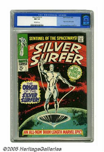 <B>The Silver Surfer #1 (Marvel, 1968) CGC NM 9.4 Off-white pages.</B></I> For the first time, comic fans learned the full origin of the man who was once Norrin Radd and became the tragic hero known as the Silver Surfer. The Watcher stars in a backup feature. The comic has superb artwork throughout, with John Buscema drawing the cover and the Silver Surfer story while Gene Colan rendered the Watcher story. Overstreet 2005 NM- 9.2 value = $675. CGC census 5/05: 45 in 9.4, 15 higher.