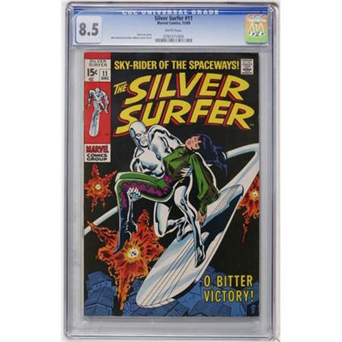<B>The Silver Surfer #11 (Marvel, 1969) CGC VF+ 8.5 White pages.</B></I> John Buscema cover and art. Overstreet 2007 VF 8.0 value = $53; VF/NM 9.0 value = $82. CGC census 3/08: 19 in 8.5, 69 higher. <I> From the Furfferi Collection.</B></I><BR><BR><b>Shipping:</b> Comics - Slabbed (certified) (<a target="_blank" href="http://www.heritageauctions.com/common/shipping.php">view shipping information</a>)