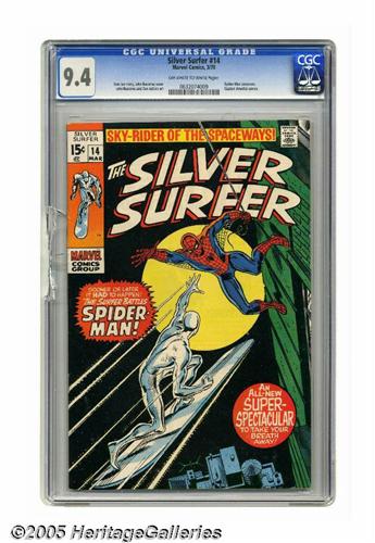 <B>The Silver Surfer #14 (Marvel, 1970) CGC NM 9.4 Off-white to white pages.</B></I> The later issues of this title had more of a "superhero" orientation and less moody/broody stuff. This one not only guest-stars Spider-Man, it has cameos by Captain America, the Sub-Mariner, and the Thing. The art is by John Buscema, inked by Dan Adkins. Overstreet 2005 NM- 9.2 value = $165. CGC census 4/05: 18 in 9.4, 5 higher.