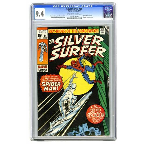 <B>The Silver Surfer #14 (Marvel, 1970) CGC NM 9.4 Off-white to white pages.</B></I> Spider-Man guest-stars in this "Super-Spectacular" issue, and he's not alone; Captain America puts in a cameo appearance as well. Art is provided by John Buscema on pencils, inked by Dan Adkins. Overstreet 2005 NM- 9.2 value = $165. CGC census 12/05: 22 in 9.4, 6 higher.