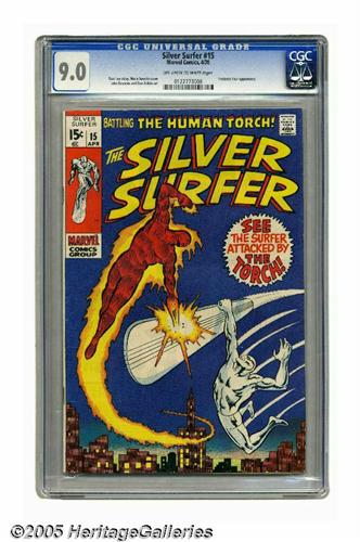 <B>The Silver Surfer #15 (Marvel, 1970) CGC VF/NM 9.0 Off-white to white pages.</B></I> The Silver Surfer battles the Human Torch in this issue. The Thing and Mr. Fantastic also appear. Marie Severin on the cover, and John Buscema and Dan Adkins on the interior are the artists. Overstreet 2005 VF/NM 9.0 value = $78; NM- 9.2 value = $100. CGC census 7/05: 64 in 9.0, 108 higher.