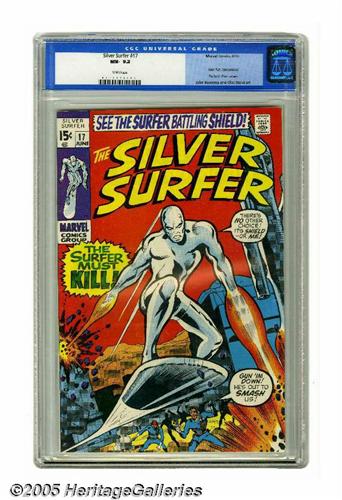 <B>The Silver Surfer #17 (Marvel, 1970) CGC NM- 9.2 White pages.</B></I> Mephisto has captured Shalla Bal and forced the Silver Surfer to battle S.H.I.E.L.D.! And as if that weren't enough, the Fantastic Four also make a brief appearance. The issue has interior art by John Buscema. The cover is by Barry Smith. Overstreet 2005 NM- 9.2 value = $100. CGC census 5/05: 9 in 9.2, 25 higher.