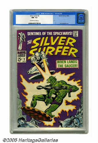 <B>The Silver Surfer #2 (Marvel, 1968) CGC NM- 9.2 Off-white to white pages.</B></I> The second installment of this cosmic series saw the Silver Surfer take on the alien race known as the Badoon (their first appearance) and gave readers a look at the Surfer's old flame Shalla Bal, who hadn't given up on her man just yet. The cover and interior art are by John Buscema. There's also a Watcher backup feature with Gene Colan art. Overstreet 2005 NM- 9.2 value = $275. CGC census 5/05: 39 in 9.2, 64 higher.