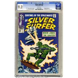 <B>The Silver Surfer #2 (Marvel, 1968) CGC NM- 9.2 White pages.</B></I> John Buscema and Joe Sinnott make an impressive art team on the Surfer's adventures, and to sweeten the pot, this double-sized classic includes a Watcher backup drawn by Gene Colan and Paul Reinman. First appearance of the Brotherhood of Badoon. A gorgeous high-grade copy. Overstreet 2004 NM- 9.2 value = $275. <BR><BR><B>Important notice:</B> Heritage usually auctions material at the rate of 200-250 lots per hour. On some occasions eBay Live bid software or the Internet may not be able to keep up with the pace of the auction. We recommend placing a realistic absentee bid now as insurance to avoid disappointment. Occasionally the auctioneer may eliminate or reject an eBay Live bid, and the auctioneer may also reopen a lot after the close of the eBay live bidding (usually because we missed an audience bid), and may reject your bid even if it shows you as the winning bidder. By bidding via eBay Live, you agree that Heritage may award the lot to another bidder at its sole discretion under the circumstances described above or any other reasonable circumstances. Since eBay bids are not shown to us until we open the lot on the floor, we treat those bids just like floor bids. In most cases the floor responds before the eBay bid is presented to us, due to Internet lag time, so for consistency we have made it a policy that floor bids are always considered first over tie eBay live bids. Also please note that all Heritage lots purchased through eBay Live carry a 20% Buyer's Premium. Please make sure you read the Terms and Conditions before you bid. </span></font></tr></table></td></tr></table>