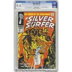 <B>The Silver Surfer #3 (Marvel, 1968) CGC NM 9.4 Off-white to white pages.</B></I> Mephisto makes his first macabre appearance in this double-sized issue, which includes the "Tales of the Watcher" backup series. An astounding specimen, bristling with vibrant cover gloss and colors (just look at that fiery cover scene!), and a sharp square bound spine. CGC has awarded only one higher grade to a copy of this issue to date. Overstreet 2004 NM- 9.2 value = $235. <BR><BR><B>Important notice:</B> Heritage usually auctions material at the rate of 200-250 lots per hour. On some occasions eBay Live bid software or the Internet may not be able to keep up with the pace of the auction. We recommend placing a realistic absentee bid now as insurance to avoid disappointment. Occasionally the auctioneer may eliminate or reject an eBay Live bid, and the auctioneer may also reopen a lot after the close of the eBay live bidding (usually because we missed an audience bid), and may reject your bid even if it shows you as the winning bidder. By bidding via eBay Live, you agree that Heritage may award the lot to another bidder at its sole discretion under the circumstances described above or any other reasonable circumstances. Since eBay bids are not shown to us until we open the lot on the floor, we treat those bids just like floor bids. In most cases the floor responds before the eBay bid is presented to us, due to Internet lag time, so for consistency we have made it a policy that floor bids are always considered first over tie eBay live bids. Also please note that all Heritage lots purchased through eBay Live carry a 20% Buyer's Premium. Please make sure you read the Terms and Conditions before you bid. </span></font></tr></table></td></tr></table>