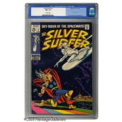 <B>The Silver Surfer #4 (Marvel, 1969) CGC NM- 9.2 Off-white pages.</B></I> Why is Thor battling the Silver Surfer? If you guessed "the trickery of Loki", thou knowest thy Thor storylines. This issue (which experienced low distribution according to Overstreet) has cameo appearances by the Hulk, the Thing, and Hercules. The cover and interior art are by John Buscema. The Watcher backup feature is well worth a mention -- it retells one of the great Atlas stories of all, "The Terror of Tim Boo Ba" from <B>Amazing Adult Fantasy</B></I>, with Steve Ditko's original redrawn here by Howard Purcell. Overstreet 2004 NM- 9.2 value = $600. CGC census 12/04: 42 in 9.2, 60 higher.